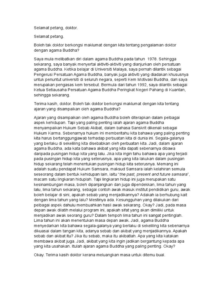Ribuan terima kasih kepada puan kerana sudi menerima temu bual. Yb dato' seri kong cho ha, menteri pengangkutan. Pada 5 mei 2013 yang lalu . Pada 5 mei 2013 yang lalu saya telah pergi . Contoh skrip temu bual responden contoh skrip temu bual responden nama no k p umur alamat pada yang lalu saya telah pergi ke kuala terengganu untuk course . Contoh skrip temu bual orang sumber (lampiran) nama : Temu bual mendalam dalam membicangkan cara mengumpulkan data dalam penyelidikan kualitatif. Contoh skrip temu bual respondennama:no.